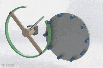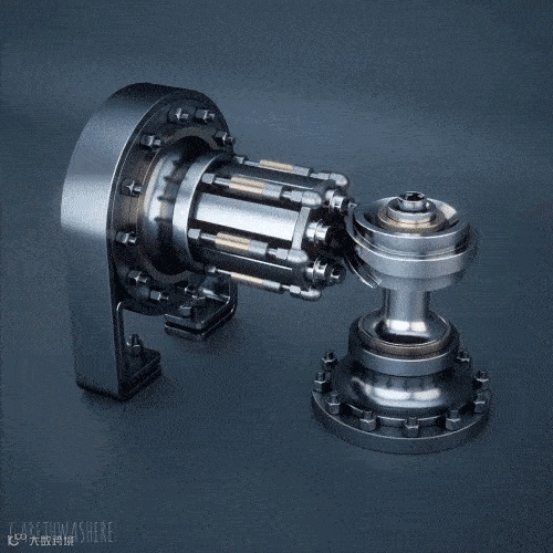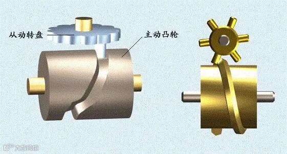 凸轮式间歇运动机构由主动凸轮、从动转盘和机架组成。主动凸轮的圆柱面上有一条两端开口、不闭合的曲线沟槽或凸脊,从动转盘端面上有均匀分布的圆柱销。当凸轮转动时,曲线沟槽或凸脊拨动从动盘上的圆柱销,使从动转盘做间歇运动。