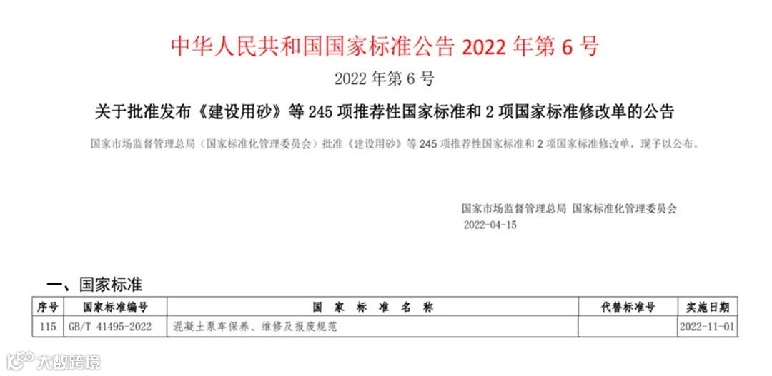 近日,国家市场监督管理总局和国家标准化管理委员会发布国家标准公告。GB/T 41495-2022《混凝土泵车保养、维修及报废规范》和GB/T 26409-2022《流动式混凝土泵》两项国家标准正式发布,不仅为国家和行业的监管执行提供了具体依据,也再次彰显出标准的主导制修订单位——中联重科在混凝土泵送机械领域的技术领先优势和标准领导地位。