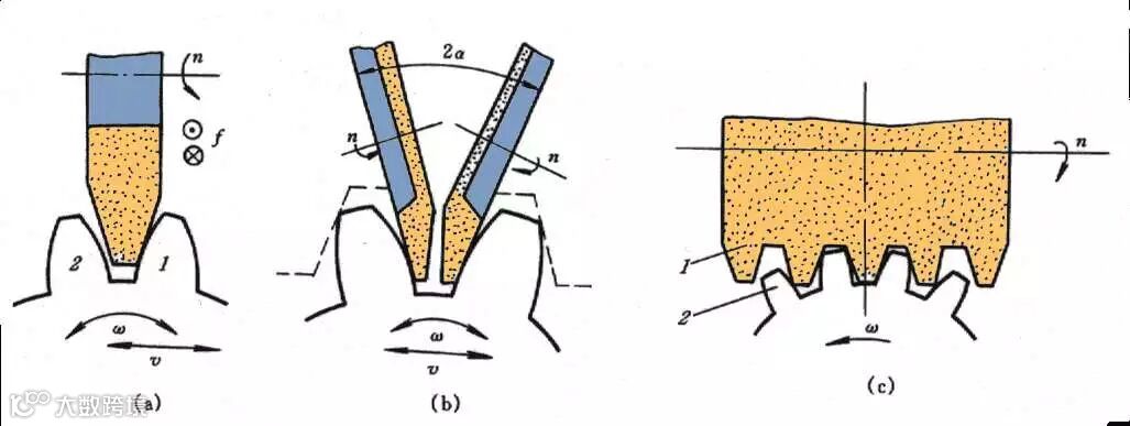 上图依次为a.锥形砂轮磨齿,b.蝶形砂轮磨齿,c.蜗杆砂轮磨齿。