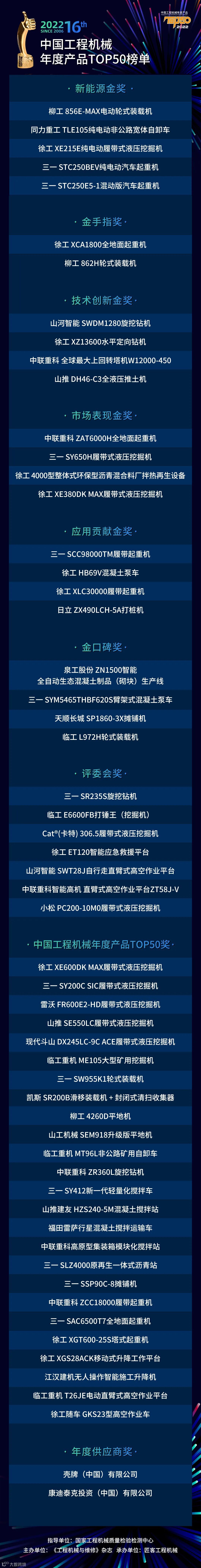 2022年4月16日,“2022中国工程机械年度产品TOP50”颁奖典礼以“线上+线下”方式盛大举行,隆重揭晓了“2022中国工程机械年度产品TOP50”金手指奖、技术创新金奖、市场表现金奖、应用贡献金奖、金口碑奖、评委会奖、年度TOP50奖、年度供应商和首次评选的新能源金奖等重磅奖项。