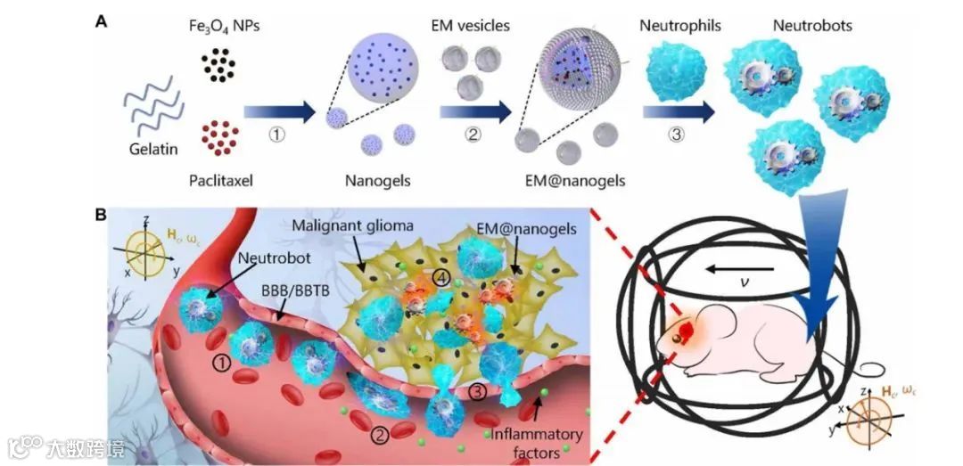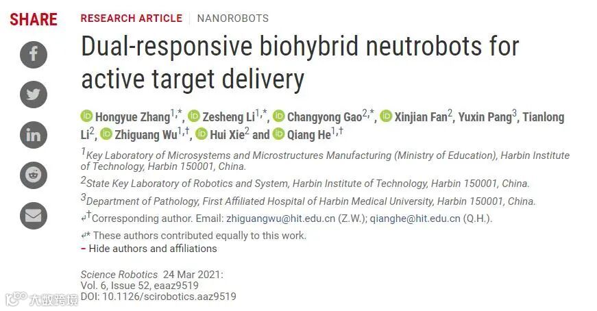 哈工大微纳米技术研究中心贺强、吴志光教授团队在 Science Robotics 发表了一篇论文,通过设计一种游动微纳米机器人将药物输送至小鼠的组织,从而治愈了小鼠的脑瘤。