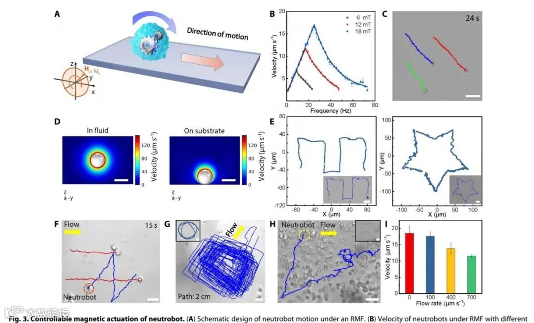 为了解决这一难题,他们设计了一种使用磁性材料的微型机器人,并利用旋转磁场对机器人进行远程导航。这款微型机器人的宽度大约只有人类头发丝的百分之一,从而可以毫不费劲地游动。研究者将这种基于嗜中性粒细胞(白血细胞的一种)的微型机器人命名为「中性机器人」(Neutrobot ),它能够在小鼠尾部血液和大脑之间自由游动,并用来治疗胶质细胞中的肿瘤。