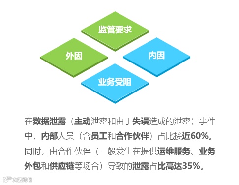 第二个方面是内因,如果我们数据遭到攻击被泄露,也会受到影响,内部不当和无意处理造成的泄露问题会更加严峻。当我们有一些安全事件是因为内因产生之后,对经营造成影响会更大。内因也带来首先要保证怎么样合规、怎么样安全、怎么样不阻碍业务。