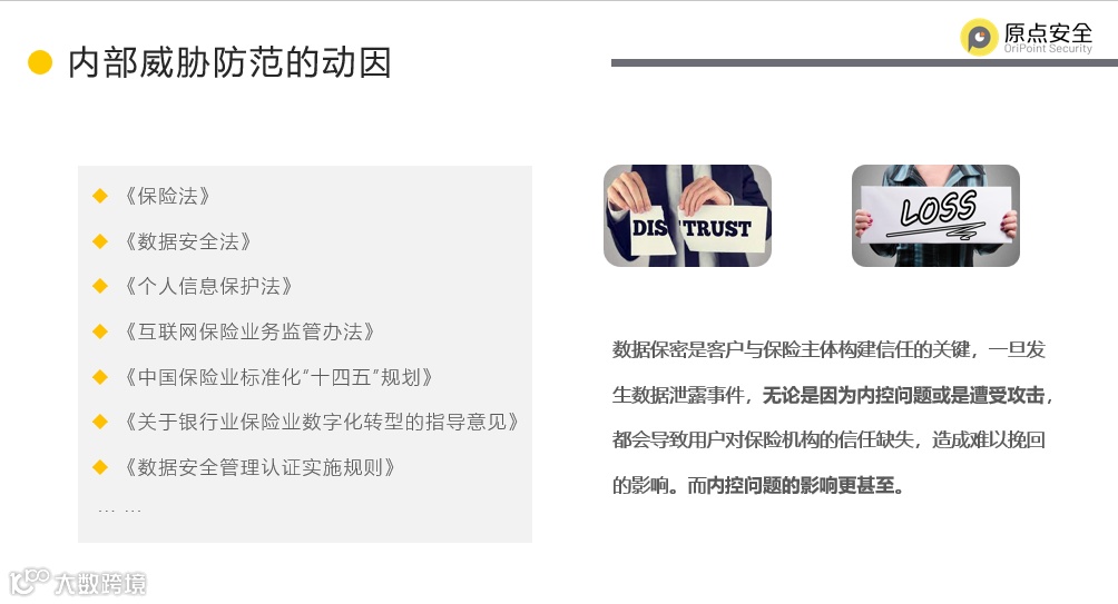 内部威胁防范这件事情,从早期的《保险法》到《数安法》、《个保法》以及行业规定,都在强调数据的安全问题,对个人敏感信息的访问、使用都有一些要求监管。尤其是刚刚发布的《关于开展银行保险机构侵害个人信息权益乱象专项整治工作的通知》,在个人信息传输和存储、个人信息查询、第三方合作等方面都在强调这方面的问题。