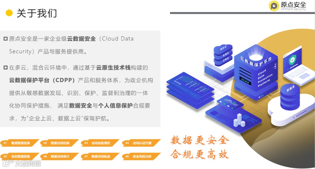 原点安全CDPP以一体化平台提供八项防范能力:敏感数据目录、数据访问控制、访问自助授权、访问认证代理、动态数据脱敏、数据访问审计、数据访问轨迹、安全风险分析。