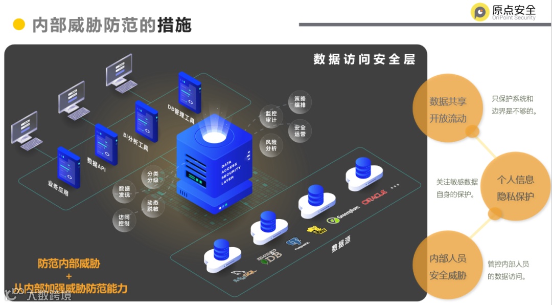 原点安全专注于构建通用的“数据访问安全层”,在这一层以“解耦化机制”、“一体化协同”、“服务化交付”、“云原生架构”四大特性为基础,提供敏感数据目录、数据访问控制、数据动态脱敏、数据访问审计、数据风险分析等保护措施。内部威胁防范有两层含义,一个是防范内部威胁,面向内部研发、运维、数据工程人员有意或无意的风险行为,第二个是通过构建“数据访问安全层”,从内部加强我们威胁防范的安全能力。