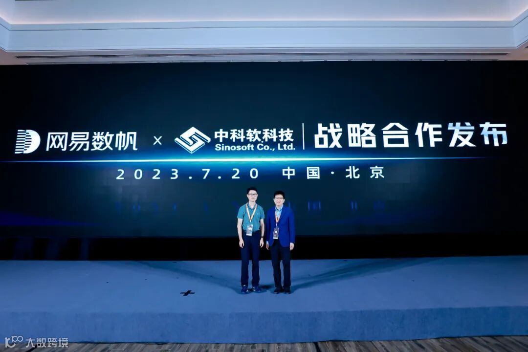 会上,汪总和中科软执行高级副总裁孙熙杰进行了网易数帆与中科软科技战略合作发布仪式,双方通过强强联合,共同探讨金融领域深度融合方案,为保险行业数智化转型加速升级。