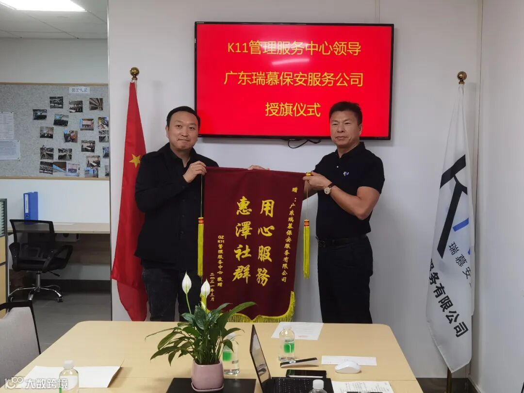 2021年4月8日上午,我司受K11管理服务中心邀请,来到我司驻K11项目管理部,参加K11管理服务中心对我司的授旗暨嘉奖仪式,公司董事长郭韩惠先生、副总经理冯宝奎先生、项目总监许建军先生等相关负责人及员工出席了此次仪式。