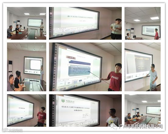 在新欧实习的武汉科技大学研究生黄剑、王汝成、曾银川和中国农业大学研究生李连杰分别从基于SOM(自适应)的设备劣化状态识别方法; 基于labview的液压泵、马达试验台设计;基于应变片的液压缸内泄露测量;动态压力调节电磁阀的设计及内部流动数值研究,4个课题介绍了他们在新欧实习情况及科研选题初步方案。公司的专业人员对此发表了相关的意见和建议。