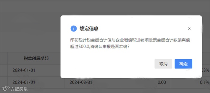 “印花税计税金额合计值与企业增值税进销项发票金额合计数偏离值超过500,请确认申报是否准确?”