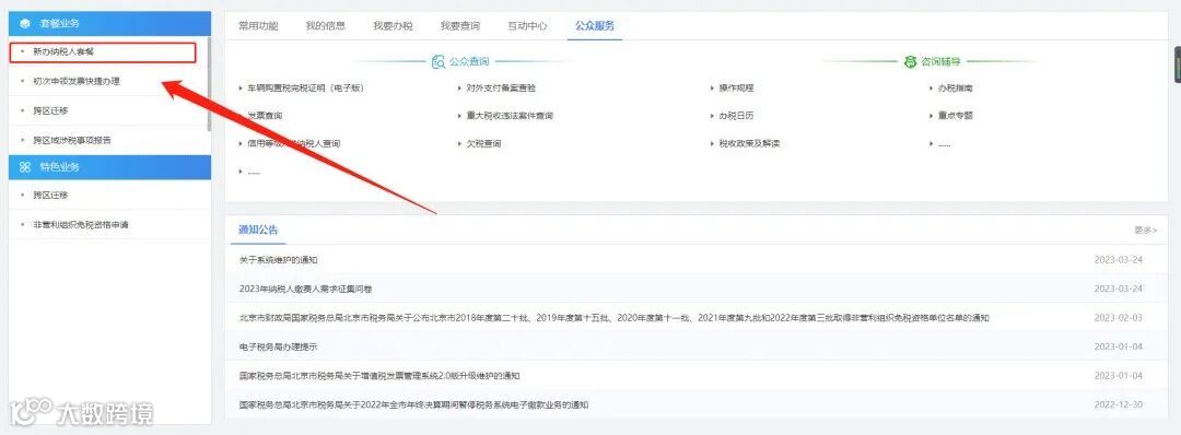 2.进入主界面,选择左侧栏“特色业务”中的【新办纳税人套餐】。
