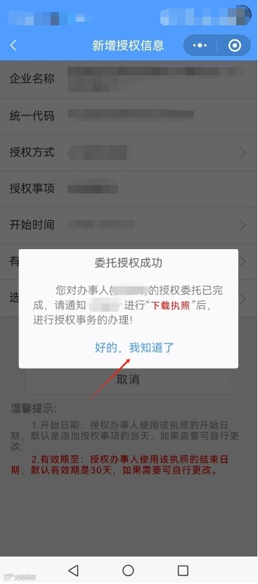 委托授权成功,点击“好的,我知道了”,被委托人可登录电子营业执照小程序下载营业执照,办理相关业务。