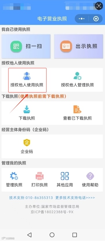 电子营业执照可以授权他人使用执照,也可以授权他人管理执照,以授权他人使用执照为例演示操作流程。