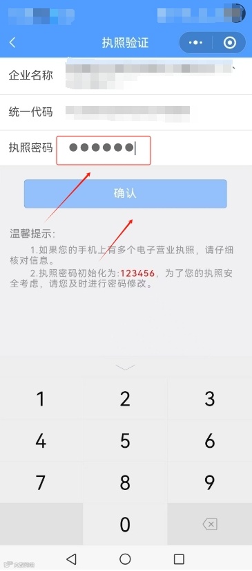 填写执照密码,若执照密码未更改,则填写初始密码:123456。