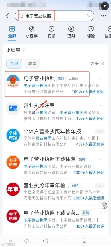 3.在“小程序”里搜索“电子营业执照”;