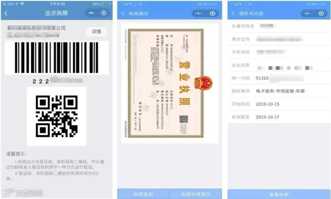 线下办理业务时,不必携带纸质营业执照,点击小程序中的“出示执照”,工作人员通过扫描条形码、二维码后,就能收到电子营业执照的信息。