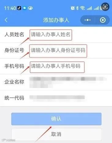 填写办事人员姓名、身份证号、手机号码,填写完点击“确认”。