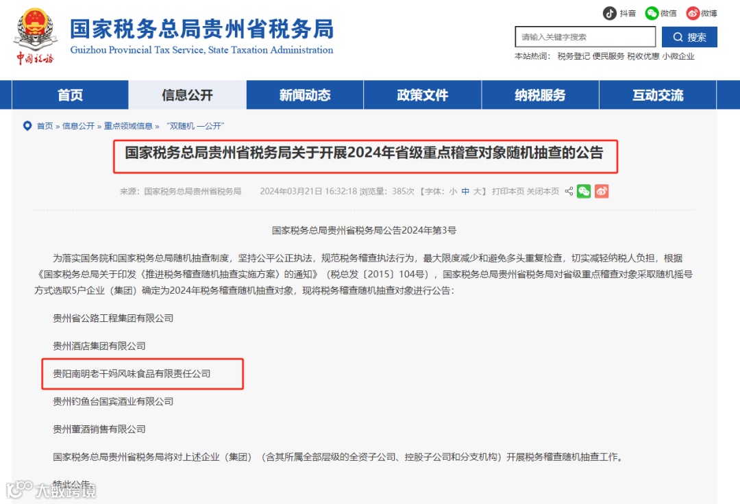 老干妈,你多久没吃过了?近日,贵州省税务局发布关于开展2024年省级重点稽查对象随机抽查的公告。被抽查的公司中,老干妈赫然在列。