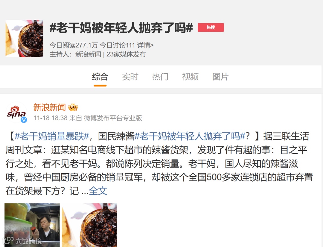 看到这则稽查通告,小编不禁想起了之前的一则微博热搜:“老干妈销量暴跌,是否已经被年轻人抛弃?”