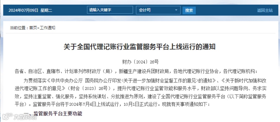 7月3日,财政部发布《关于全国代理记账行业监管服务平台上线运行的通知 》。