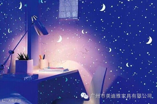 蓄光壁纸的荧光化合物材料无毒无害,是儿童房装修中不错的选择,墙面上慢慢的荧光图案代替了熄灯之后冷冷的墙面,仿佛是在睡前把孩子带劲一个童话世界一般,让故事里的人物风景和魔法也一一的栩栩如生了。
