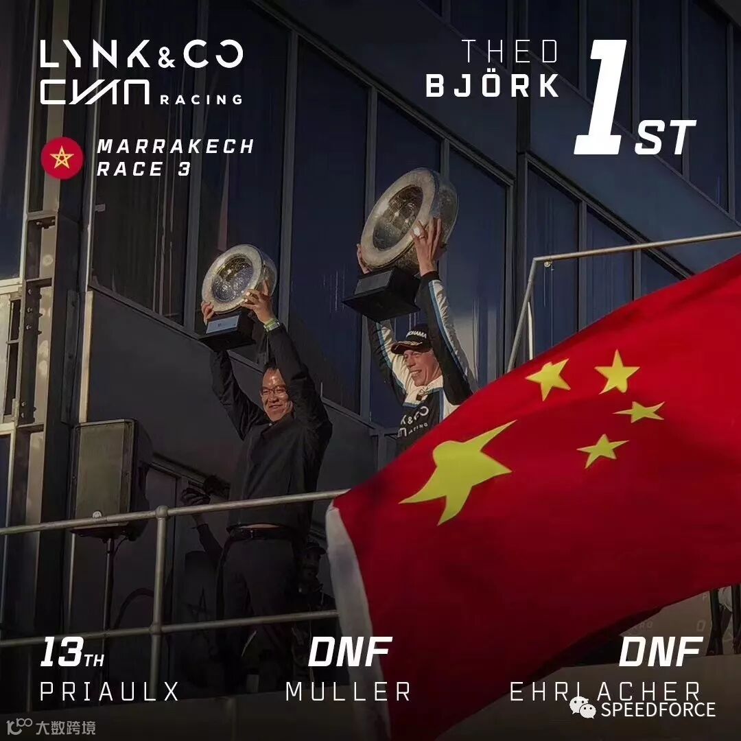 车手比约克站领奖台上挥舞中国国旗-五星红旗飘扬在摩洛哥穆莱-哈桑赛道的上空,是中国汽车界和赛车界值得纪念的一刻,吉利副总裁杨学良也一同站上领奖台,分享中国赛车的最高荣耀。