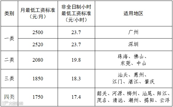 此次调整仍保持四类标准,其中广州、深圳执行一类标准,广州市调整为2500元/月,深圳市调整为2520元/月,两市对应的非全日制小时最低工资标准均为23.7元/小时;二类标准调整为2080元/月,执行地区为珠海、佛山、东莞、中山,对应的非全日制小时最低工资标准为19.8元/小时;三类标准调整为1850元/月,执行地区为汕头、惠州、江门、湛江、肇庆,对应的非全日制小时最低工资标准为18.3元/小时;四类标准调整为1750元/月,执行地区为韶关、河源、梅州等10个市,对应的非全日制小时最低工资标准为17.4元/小时。