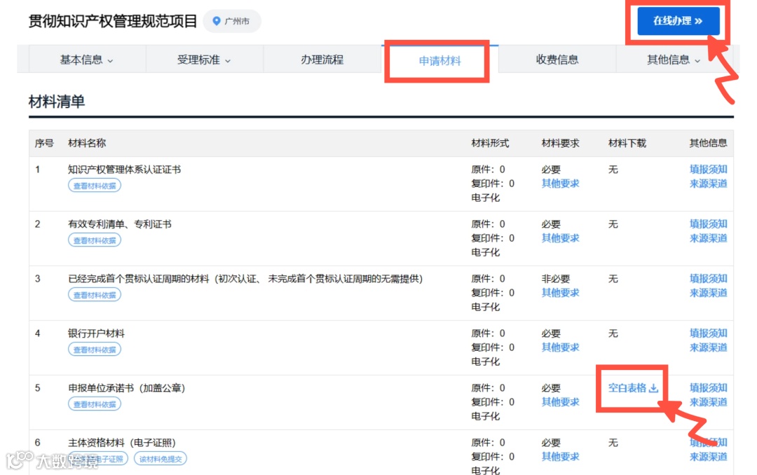 在【办事指南】中查看【申请材料】,点击【空白表格】可下载相关样表→准备好相关材料后,点击右上角【在线办理】,按照要求填写和提交材料即可。