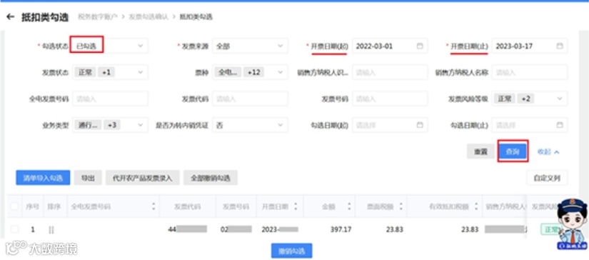 三、在【发票】页签下,勾选状态选择“未勾选”,根据需要输入或选择相关查询条件,然后点击【查询】按钮,则在勾选操作区显示符合查询条件的发票。