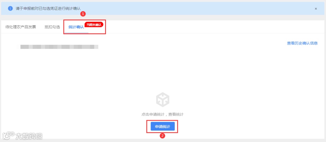 2、如果当前税款属期还未生成勾选结果的统计报表,纳税人可点击“申请统计”按钮进行统计。申请统计提交后系统将对纳税人勾选结果进行实时统计。