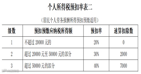 应纳税额=每次收入额*(1-20)*适用税率-速算扣除数超过20000-50000的部分,税率30%,速算扣除数2000超过50000元的部分,税率40%,速算扣除数7000