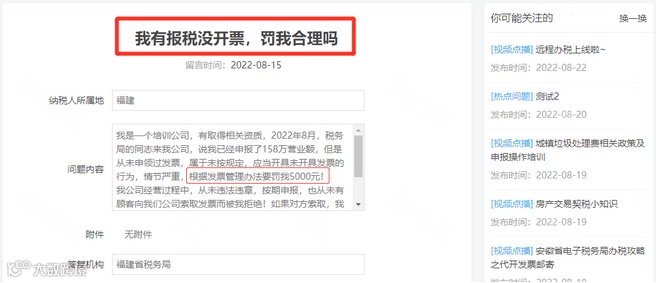 问题:我是一个培训公司,有取得相关资质,2022年8月,税务局的同志来我公司,说我已经申报了158万营业额,但是从未申领过发票,属于未按规定,应当开具未开具发票的行为,情节严重,根据发票管理办法要罚我5000元!