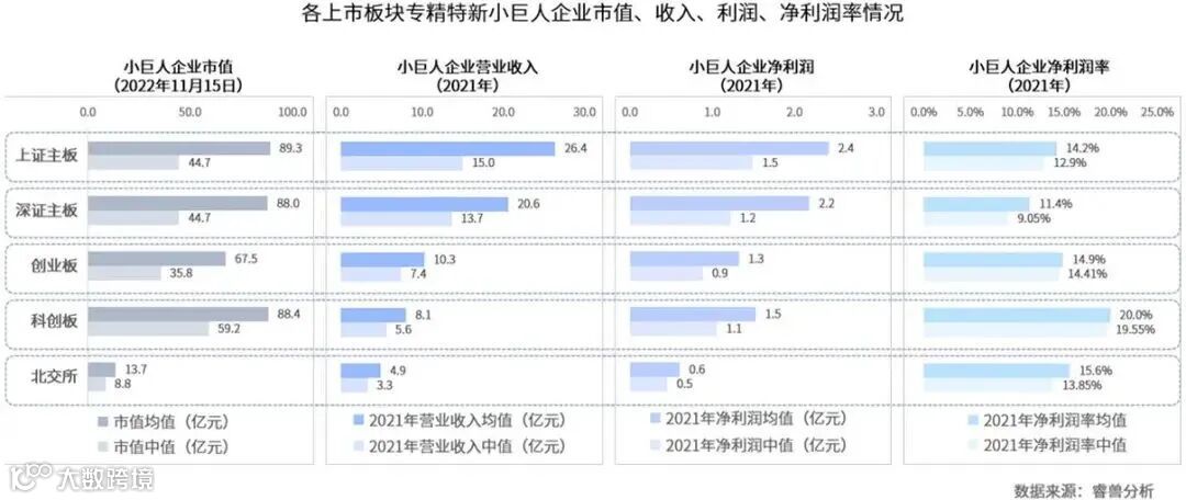 主板小巨人规模最大,科创板小巨人净利润率最高,北交所企业规模尚小