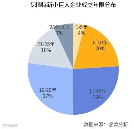 专精特新小巨人企业平均成立年限为16年,成立年限在10年及以上企业占比达到80.3%,其中成立年限在11-15年、16-20年的企业分别占比26%、27%。