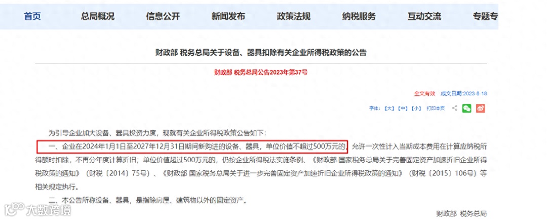 1、企业在2024年1月1日至2027年12月31日期间新购进的设备、器具,单位价值不超过500万元的,允许一次性计入当期成本费用在计算应纳税所得额时扣除,不再分年度计算折旧;单位价值超过500万元的,仍按企业所得税法实施条例等相关规定执行。