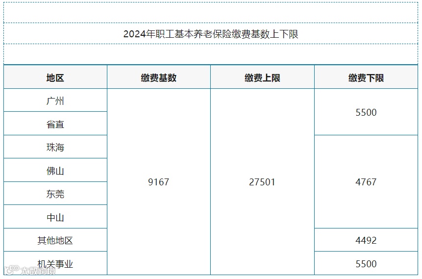按照相关通知,广东省企业职工基本养老保险缴费基数上限为27501元,《通知》的下限则按照地区采用了三个标准;