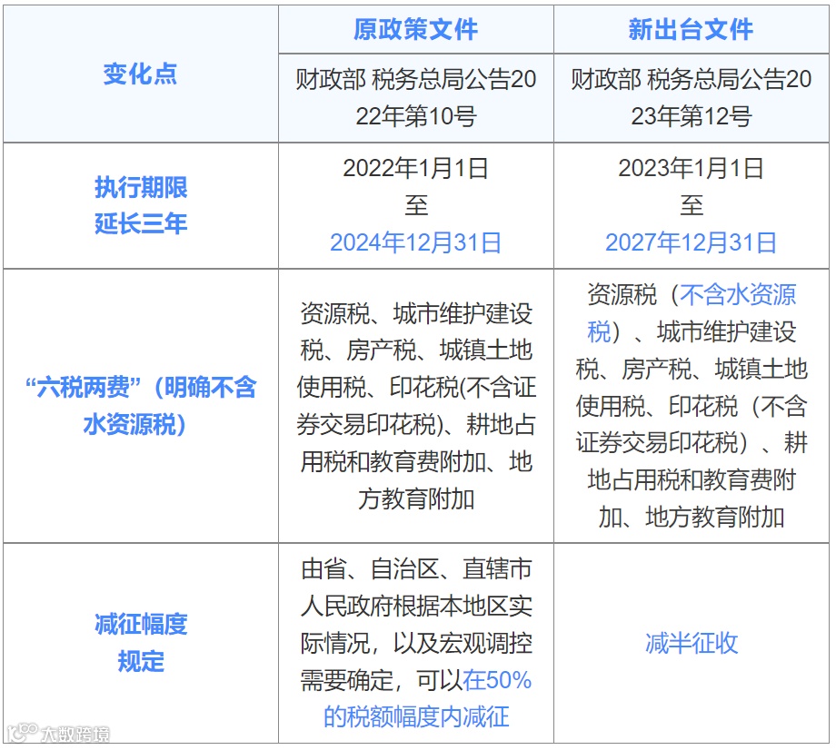 财政部、国家税务总局发布的《关于进一步支持小微企业和个体工商户发展有关税费政策的公告》(以下简称《公告》)中,小微企业“六税两费”减免政策除了执行期限有变化外,政策规定也有变化。