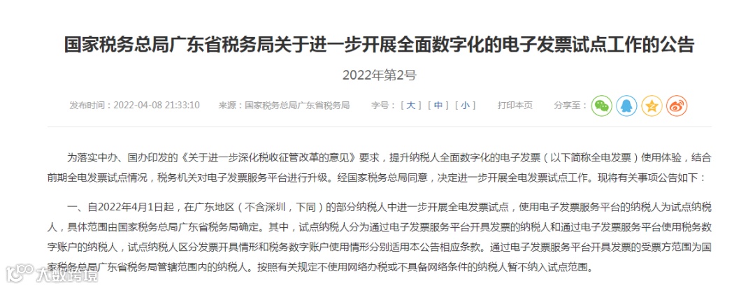 自2022年4月1日起,在广东地区(不含深圳)上线升级版电子发票服务平台,并在部分纳税人中进一步开展全电发票试点。