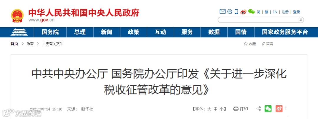 中共中央办公厅 国务院办公厅印发《关于进一步深化税收征管改革的意见》: