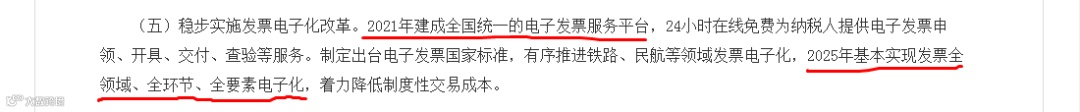 文中提到:稳步实施发票电子化改革。2021年建成全国统一的电子发票服务平台,24小时在线免费为纳税人提供电子发票申领、开具、交付、查验等服务。制定出台电子发票国家标准,有序推进铁路、民航等领域发票电子化,2025年基本实现发票全领域、全环节、全要素电子化,着力降低制度性交易成本。