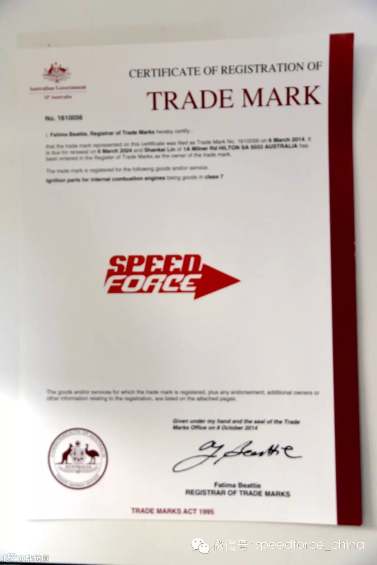 SpeedForce Technology(Australia) 澳洲SpeedForce科技公司所持品牌‘SPEEDFORCE’,并受Australia Government IP Australia 澳大利亚政府知识产权局颁发‘SPEEDFORCE’商标证书。