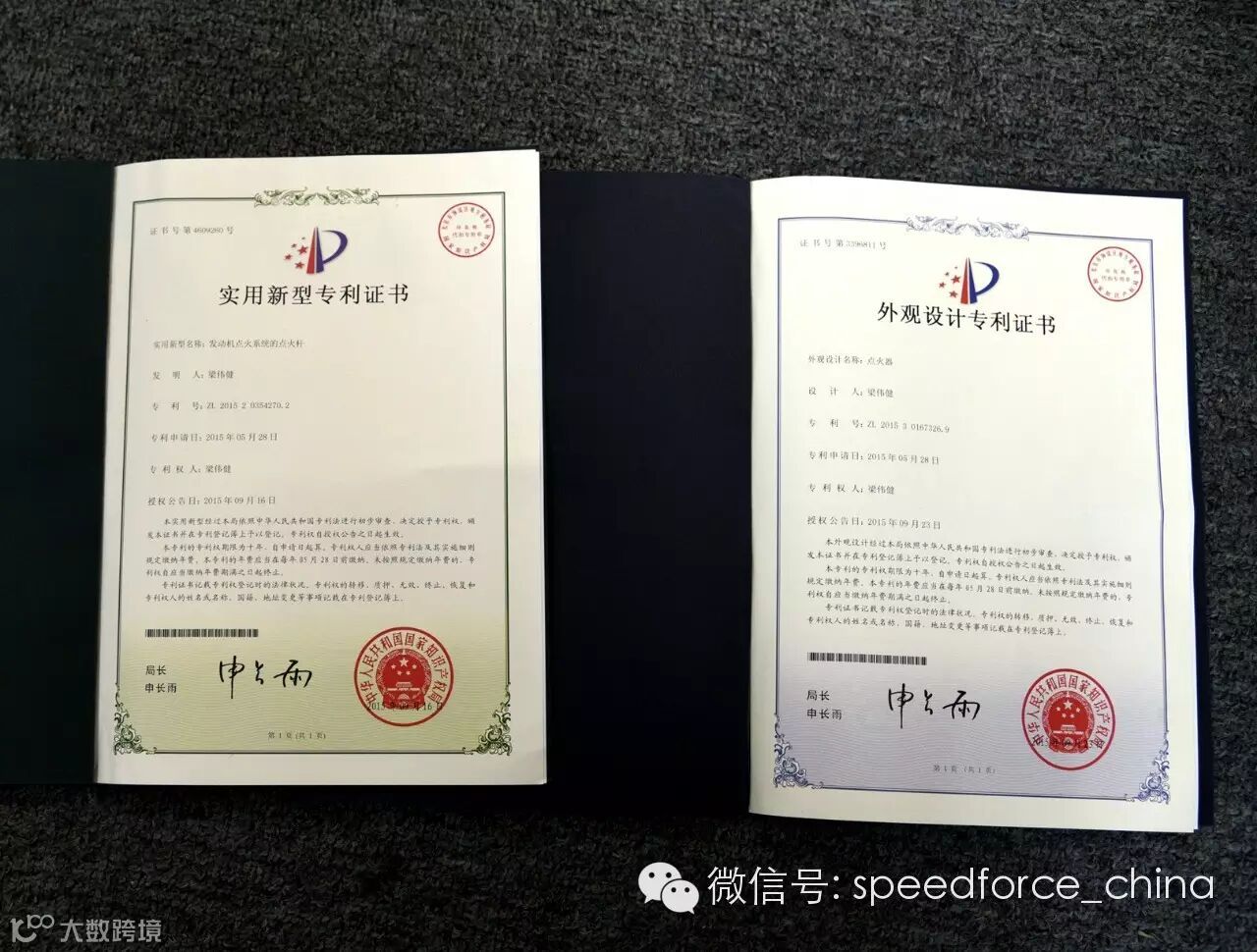 随着澳洲SpeedForce点火品牌进入中国大陆市场,因优秀而稳定的产品质量和完善的售后,产品极受汽车后市场热捧。与此同时,为了保障和维护广大客户和品牌的利益,近日SpeedForce品牌 D.R点火增强线圈系列已成功获得由中华人民共和国国家知识产权局所颁发的实用新型专利和外观设计专利。