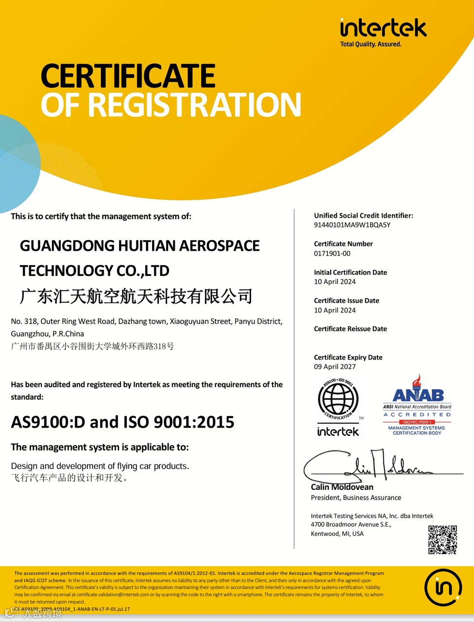 近日,小鹏汇天获得由全球权威认证机构Intertek SAI Global颁发的质量管理体系认证证书,认证范围:飞行汽车产品的设计和开发。AS9100D标准,是在ISO9001的基础上增加了航空航天质量管理特殊要求,由国际航空航天质量组织(IAQG)发布,作为航空航天行业普遍采用的质量管理体系标准,得到广泛认可。