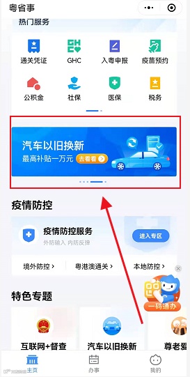 2.在“粤省事”滚动栏目或“特色专题”中进入“汽车以旧换新”栏目(官方唯一查询渠道),查询是否属于补贴对象范围。如属于补贴对象,即可参照指引转出或报废本人名下车辆。