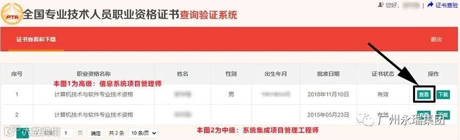 下载证书,登陆后,即可看到信息,下图为两个:计算机技术与软件专业技术资格。点击【查看】或【下载】即可下载电子版证书。