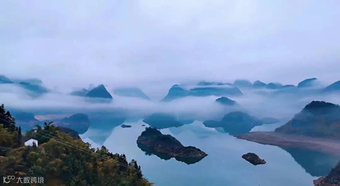 山间云雾缭绕,水中轻舟荡漾