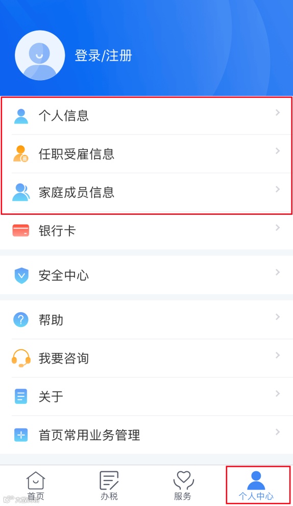 在【个人中心】模块下【个人信息】、【任职受雇信息】、【家庭成员信息】可分别查看和修改相应的基础信息。