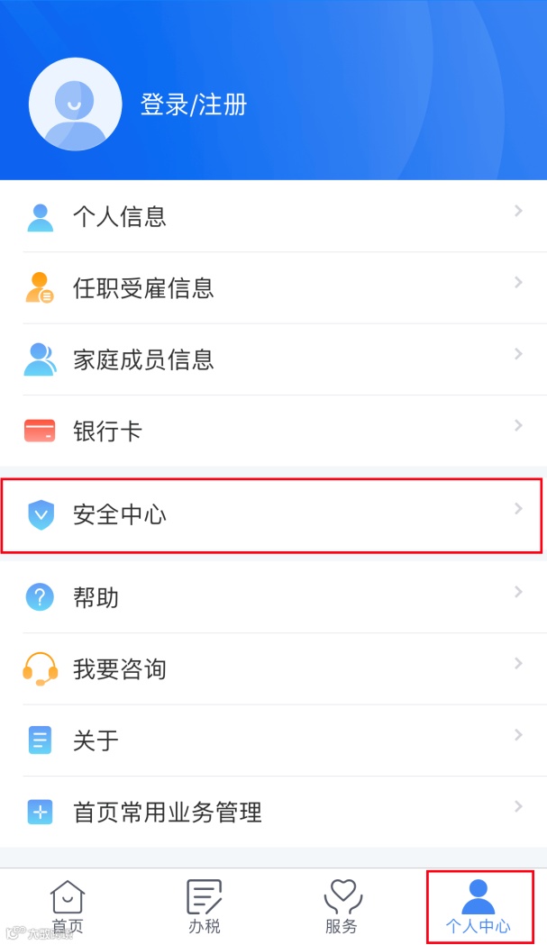 打开个人所得税APP 后显示首页页面,点击【个人中心】-【登录/注册】,可凭注册的手机号码/证件号码作为账号进行登录。