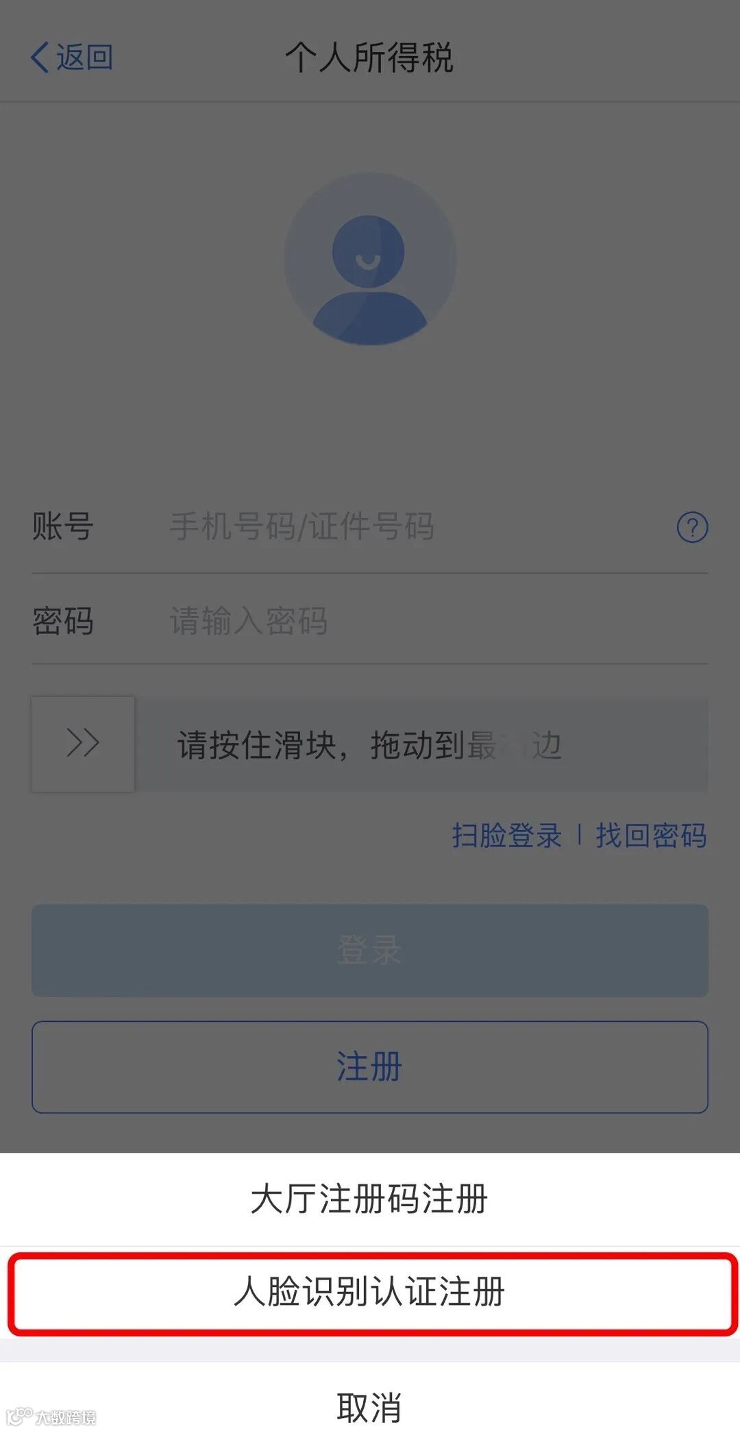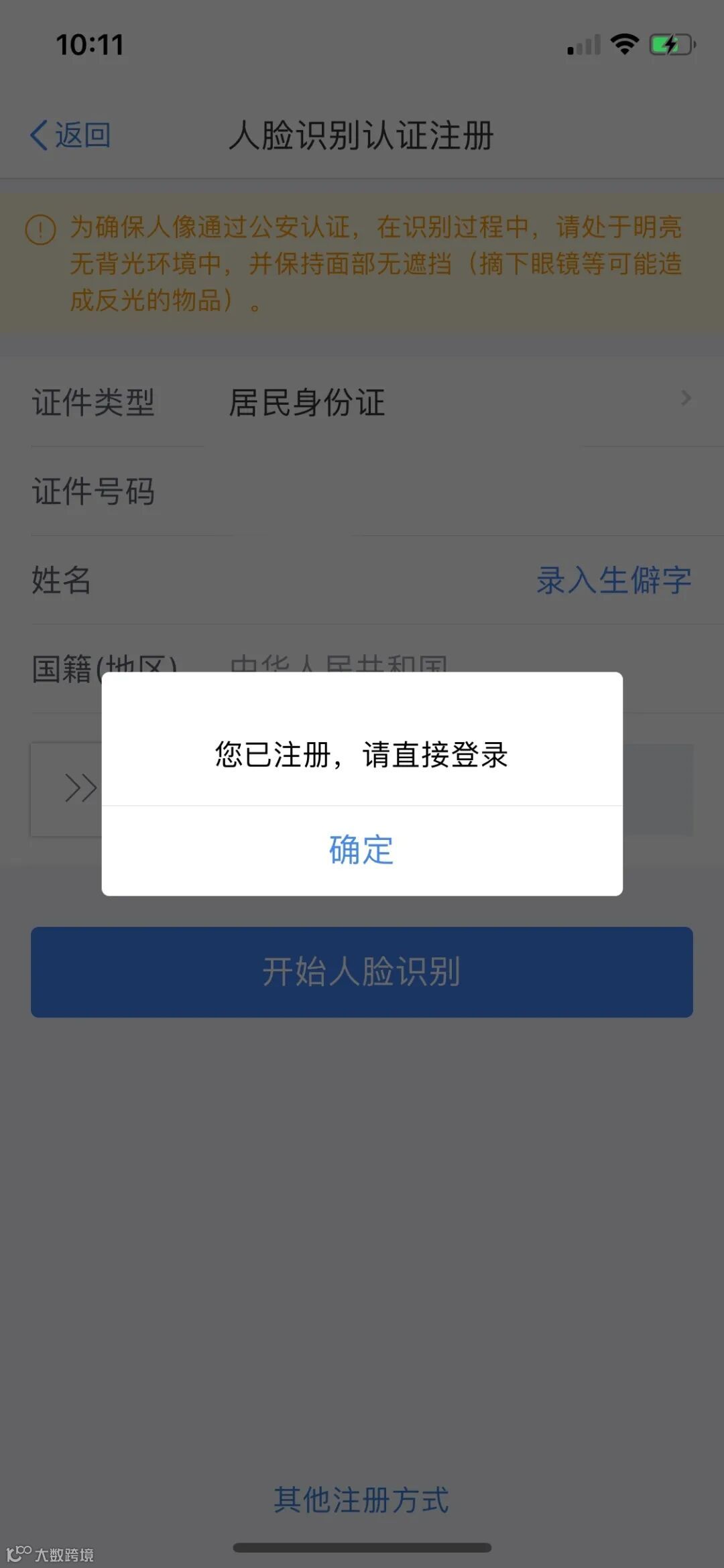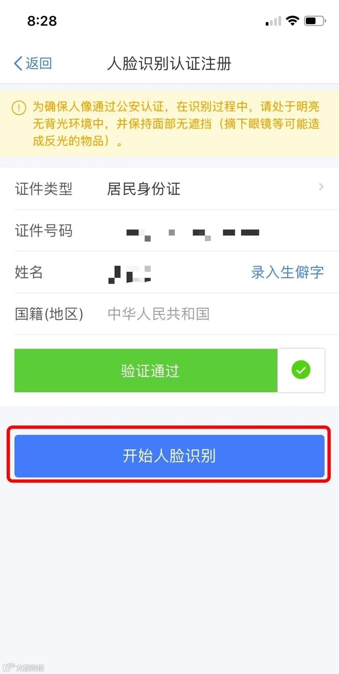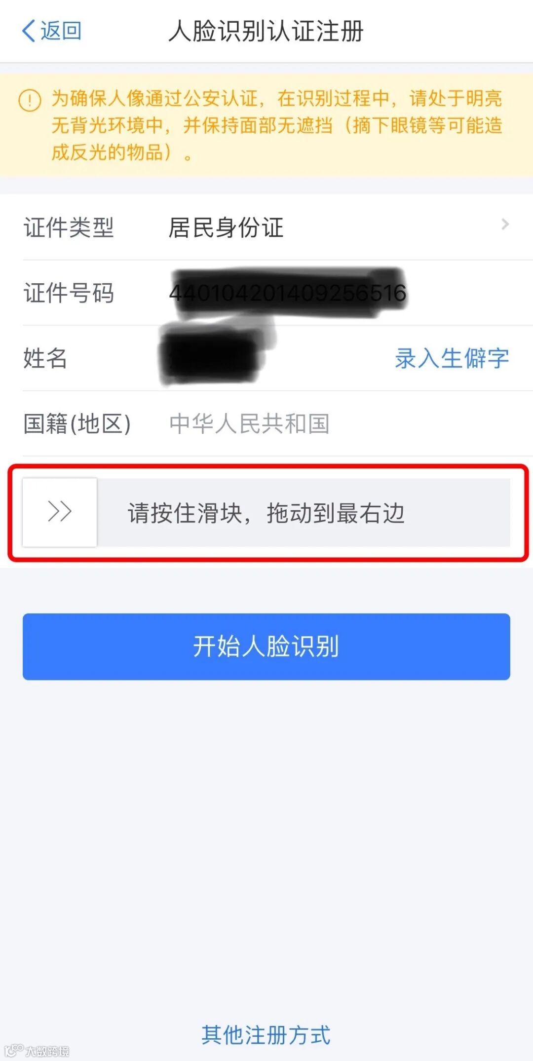 2.3阅读并同意用户注册协议,如实填写身份信息后,按住滑块,拖动到最右边,点击【开始人脸识别】