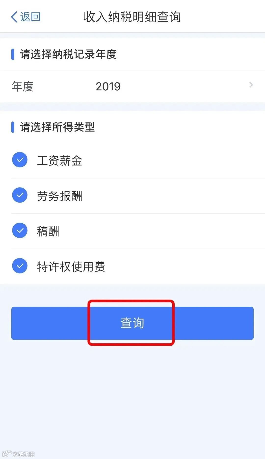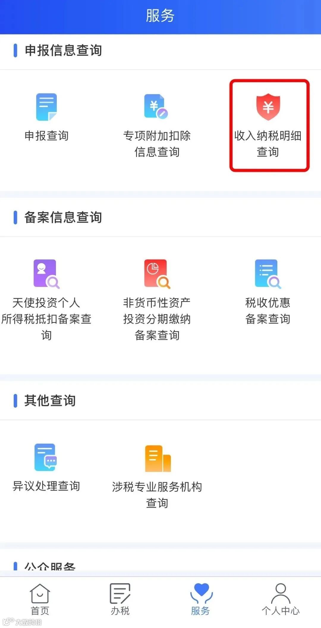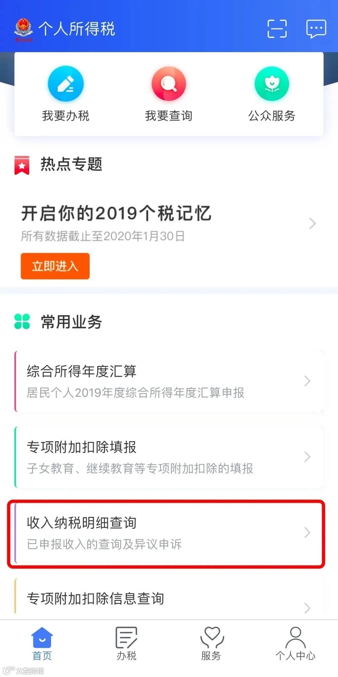 从首页-“常用业务”【收入纳税明细查询】或从服务-“申报信息查询”【收入纳税明细查询】进入,年度默认2019,点击“查询”。这里查询的是2019年度扣缴单位申报的本人全国范围内个人所得税综合所得收入及已申报税额哦!